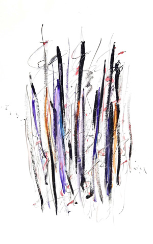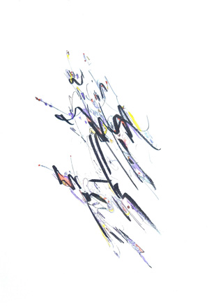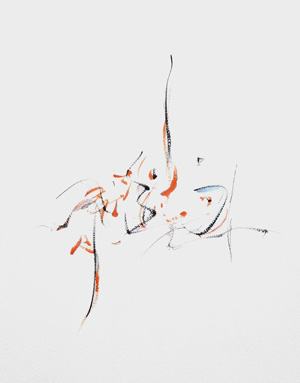 Abstraction lyrique basée sur des traits rapides de gouache rehaussés à l’aquarelle. C’est le trait qui domine et, en corollaire, l’espace vide qui l’entoure. Quelque part, il ne s’agit que d’un fractionnement de notre espace, de créer des brèches dans notre vie… Ce travail peut sembler proche, à certains moments, de la calligraphie orientale ou arabe, mais ce n’est qu’une apparence. Il n’y a aucune recherche d’écriture si ce n’est celle d’une sensation, d’une écriture du coeur.