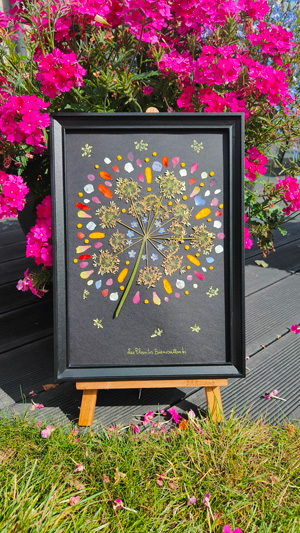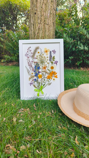 Ma démarche ? Cueillir, presser aussitôt, patienter trois semaines, trier avec soin, puis assembler délicatement chaque élément pour créer un tableau encadré. Un travail de patience qui célèbre la nature, ici ou ailleurs, et invite à ralentir pour mieux la contempler.